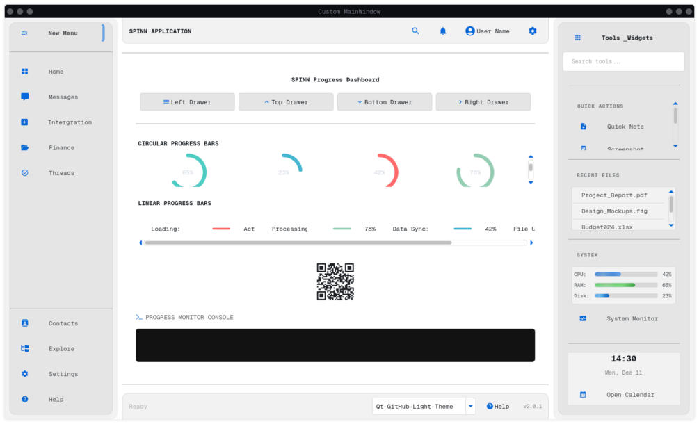 - Custom widgets such as slide-out drawers, progress bars, QR code generator, and system monitoring panels